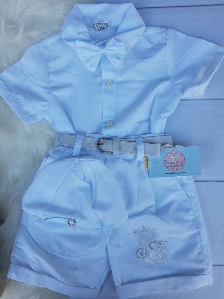 Ideal para batizados com aplique bordado, 5 peças: Boné, camisa, short, cinto e gravatinha.