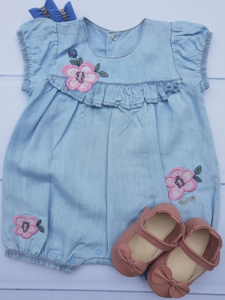 Esbanjando delicadeza e charme para as princesinhas arrasarem, nossa fofura em forma de macacãozinho, todo em jeans levinho e macio numa lavagem stone claro possui elástico confortável nas manguinhas e perninhas...