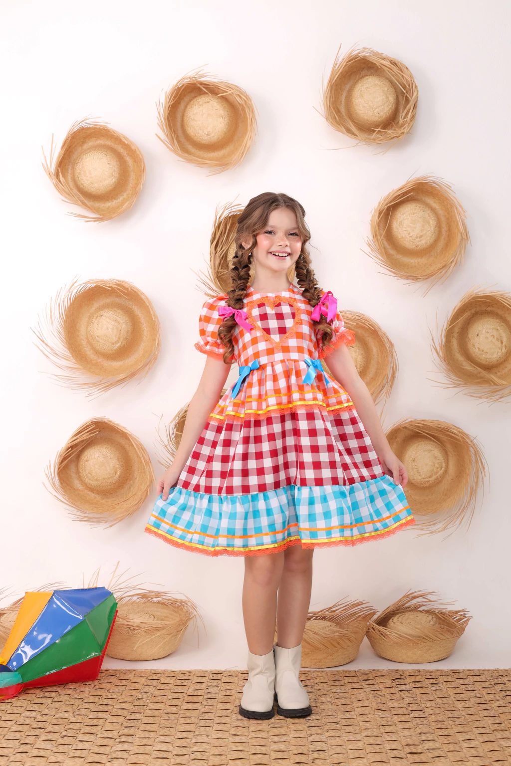 Encante-se com o nosso deslumbrante Vestido de Festa Junina Infantil Xadrez, uma obra-prima em cores vibrantes de laranja, vermelho e azul, perfeito para celebrar com estilo as festividades juninas. Este vestido exala alegria e diversão, com detalhes encantadores que o tornam verdadeiramente único.